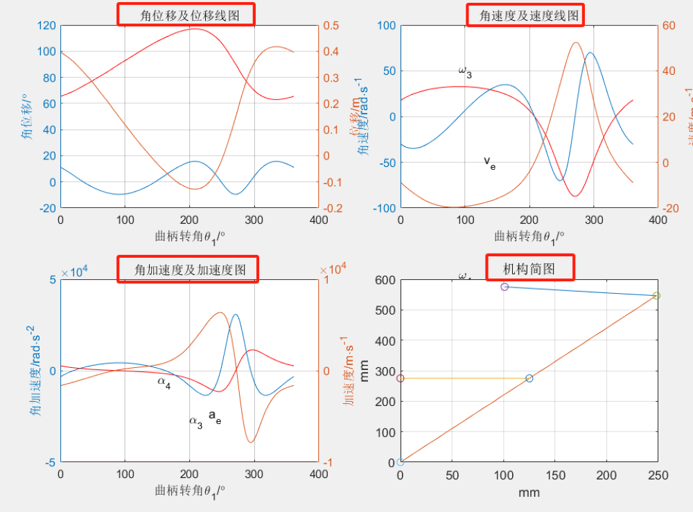 作品简介 基于matlab的一种牛头刨床的运动仿真以及运动学分析,通过运动公式及参数设置得到角位移和位移曲线,角速度和速度曲线,角加速度和加速度曲线。输出机构运动简图及动态可视化图。程序已调通,可直接运行。 创作时间: