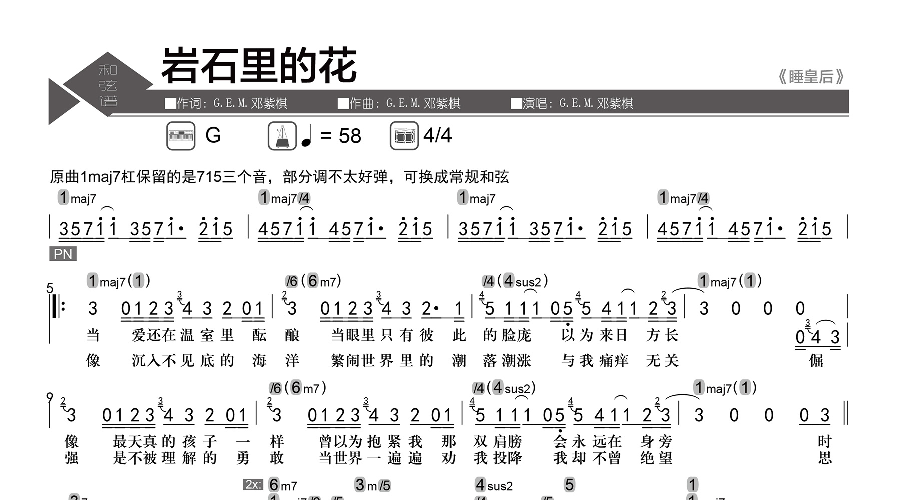 作品简介 【歌曲信息】Key:G Tempo:4/4 每分钟58拍。【整理信息】按原曲完整整理。【和弦标记】数字级数。【和弦难度】大三和弦,大六和弦,转位和弦/Slash和弦,挂留和弦,大、小、属七和弦。乐谱样式>>>>>> 创作时间: