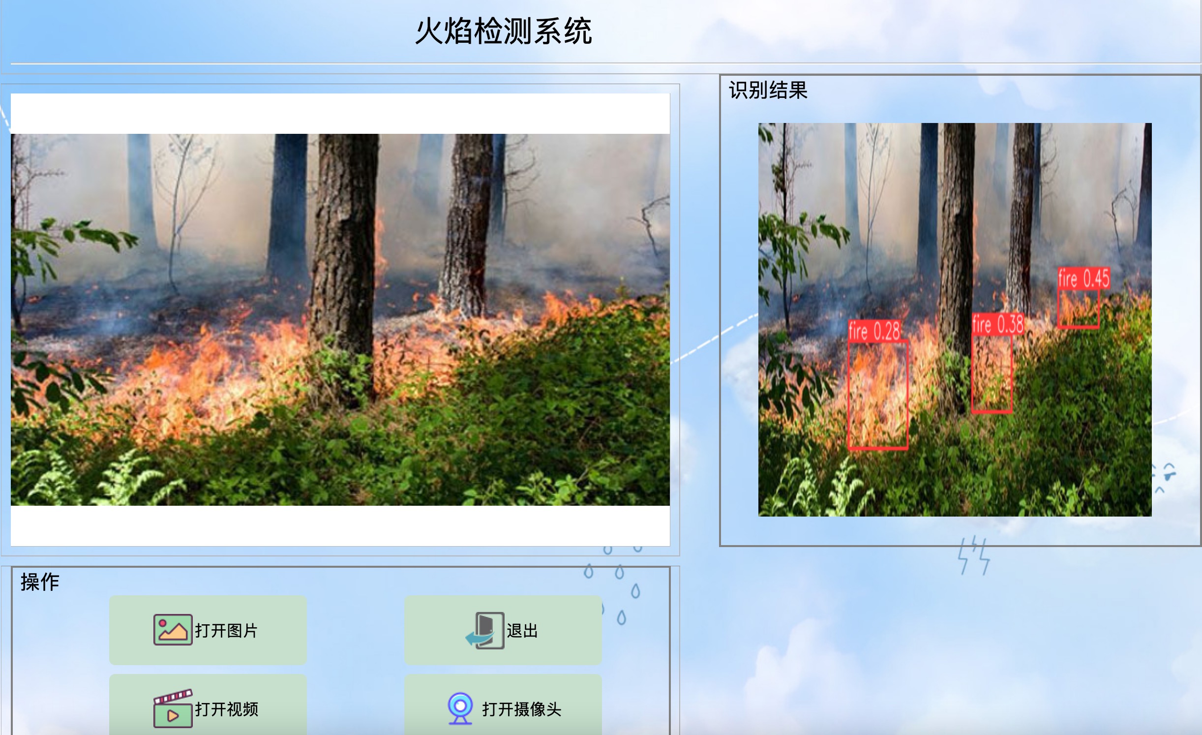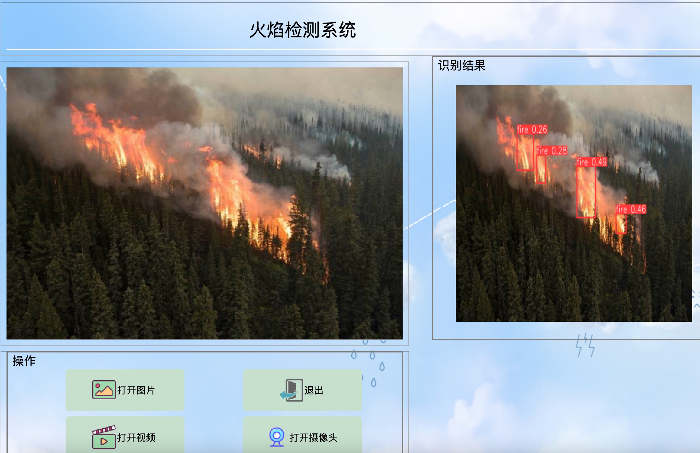 资源包含可视化的野外火焰检测系统,可用于火灾预警或火灾救援,该系统可自动检测和识别图片或视频当中出现的火焰,以及自动开启摄像头,进行火焰检测。基于最新的YOLO-v8训练的火焰检测模型和完整的python代码以及火焰检测的训练数据,下载后即可运行。