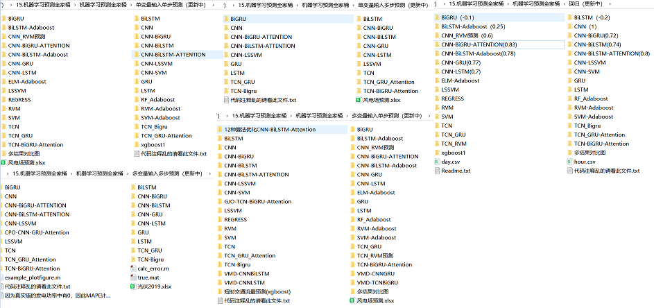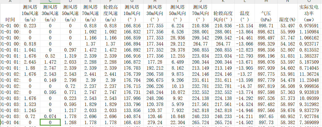 数据包含特征如下:测风塔10m风速(m/s)、测风塔30m风速(m/s)、测风塔50m风速(m/s)、测风塔70m风速(m/s)、轮毂高度风速(m/s)、测风塔10m风向(R)、测风塔30m风向(°)、测风塔50m风向(%)、测风塔70m风向(')、轮毂高度风向()、温度(%)、气压(hPa)、湿度(%)实际发电功率(mw)。部分数据截图如下: