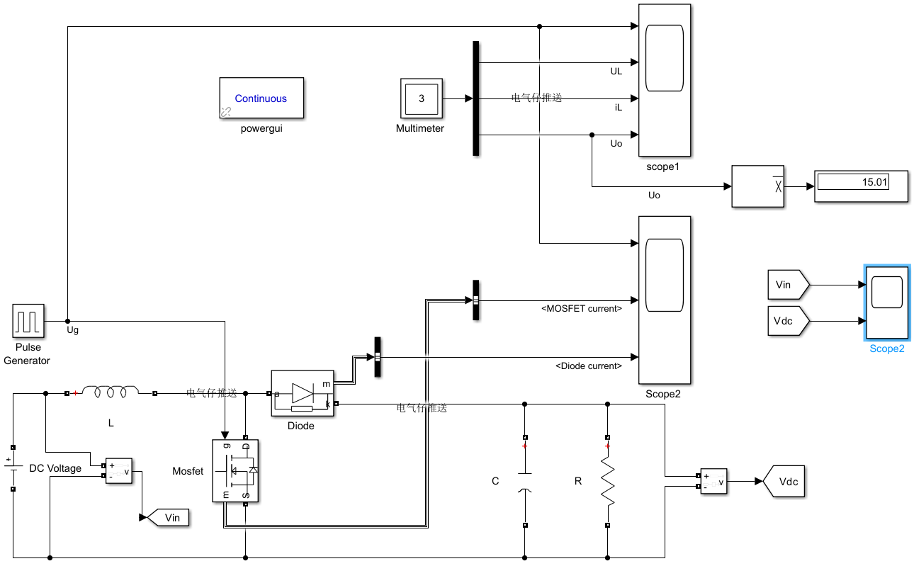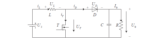 电路主要元器件包括开关管T(物理实现可以用IGBT,MOSFET),续流二极管D,储能电感L,输出滤波电容C及负载电阻R。输入直流电源为U,,输出直流电压为U。