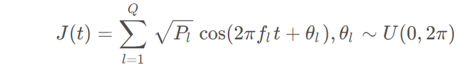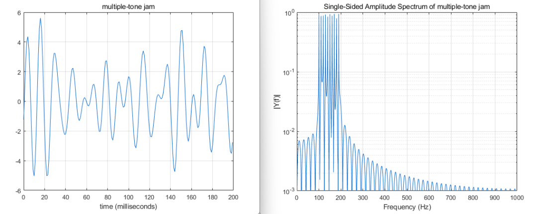 多音干扰是针对多个目标频率进行干扰,干扰信号能量相对于单音干扰分散,表现形式为多个单音干扰叠加,其表达式如下: