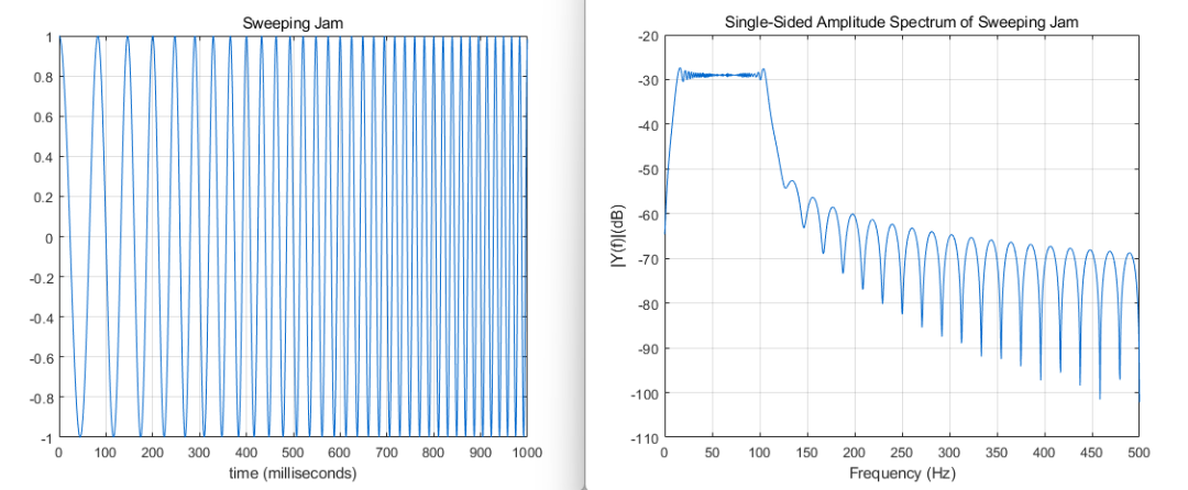 扫频干扰是扫频干扰中常见形式,干扰信号频率在一定带宽内逐渐改变,其表达式如下