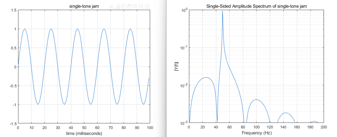 单音干扰是针对目标信号单一频点进行干扰,干扰信号能量集中于固定频率,其表达式如下: