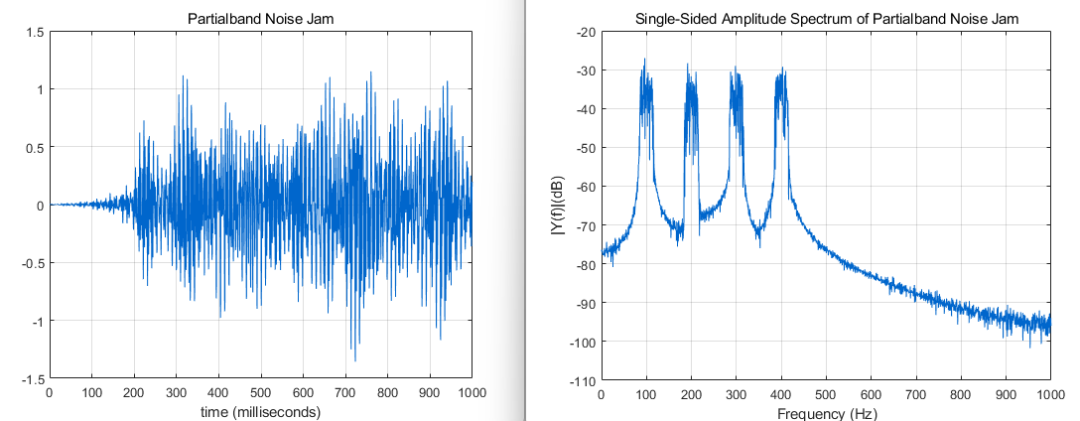 宽带噪声干扰是将高斯白噪声通过一个宽带滤波器,在每一个宽带范围内产生噪声。