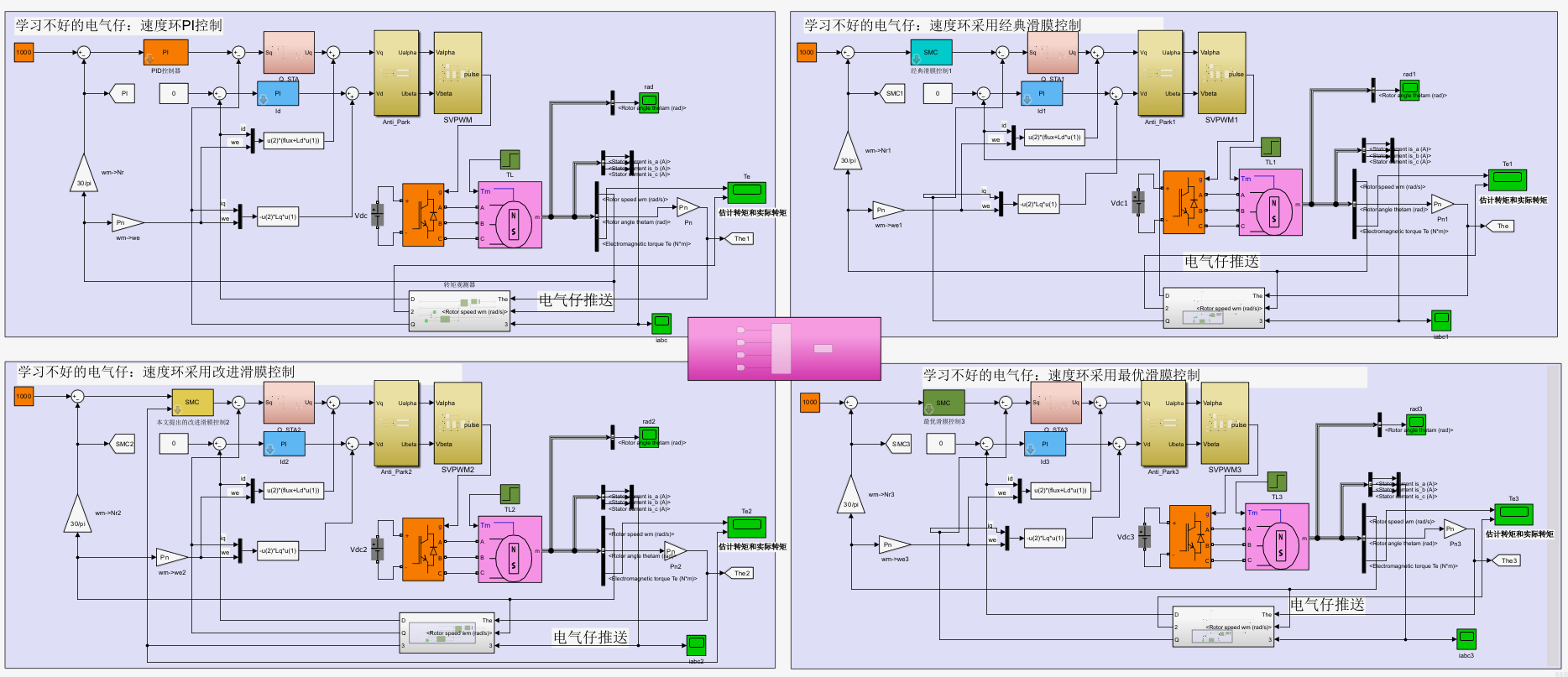 针对永磁同步电机调速系统的响应性能和抗干扰能力问题,本文做了四个仿真,分别为:永磁同步电机的PID控制调速系统、基于传统滑模控制的永磁同步电机的调速系统、最优滑模控制的永磁同步电机调速系统及改进滑膜控制的永磁同步电机调速系统。