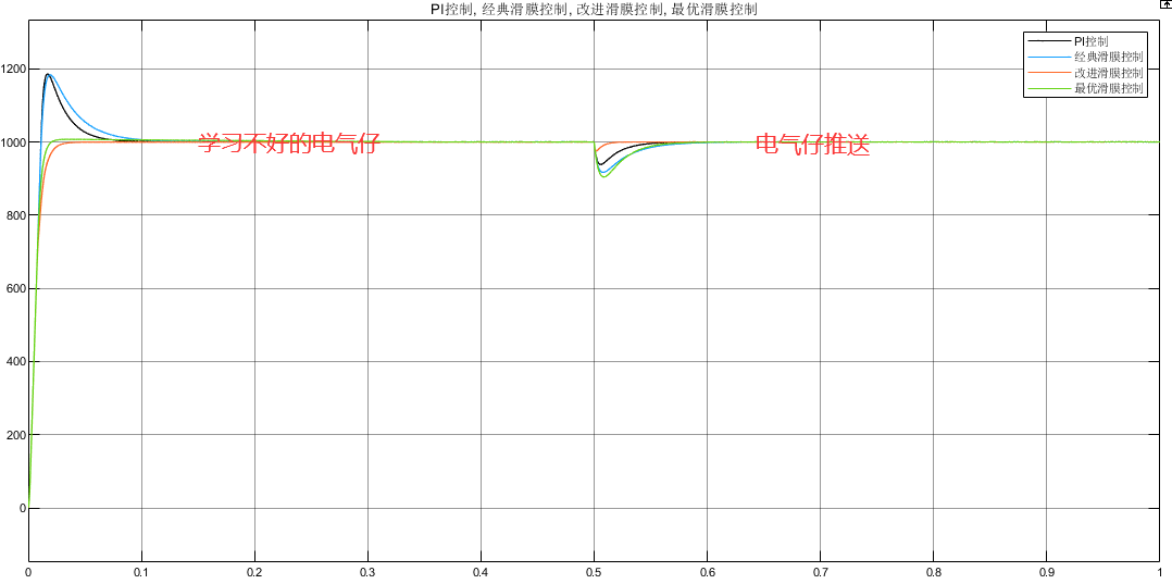 设定目标转速为1000r/min,直流侧电压 为311v,初始负载为0N.m,在0.4s突加10N.m的负载。改进滑膜控制算法、最优滑模、PI及传统滑模的速度响应曲线如下: