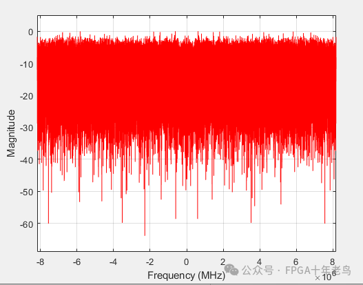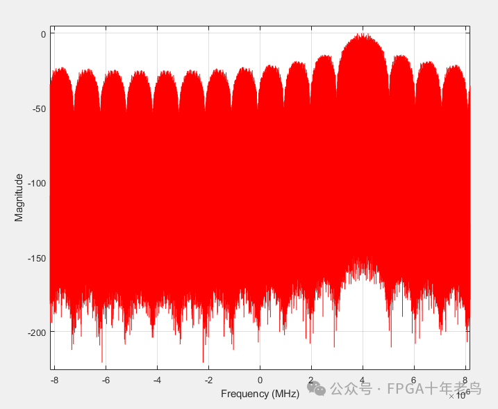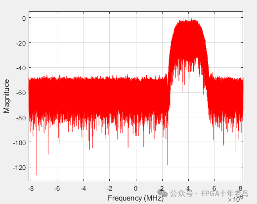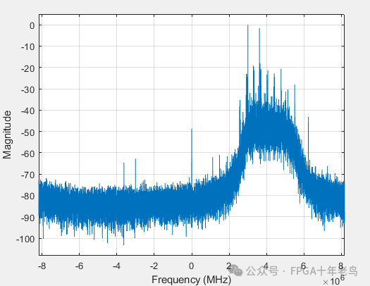 在硬件接收机的研发中,通过VIVADO的ILA,我们采集到的信号频谱如下,有一个鼓起的包络,就是带通滤波器以及添加增益后的效果