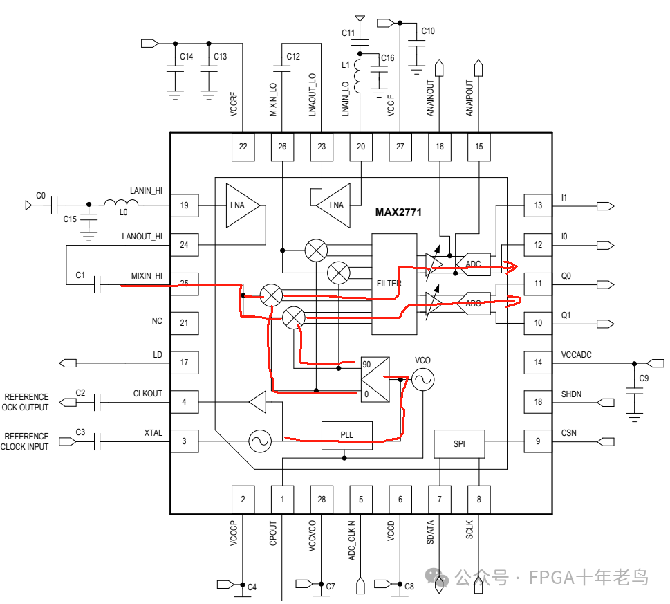 看红线部分就是信号的路径,GPS L1的信号从MIXIN_HI口输入,本地PLL输出了本地本振,分成cos和sin两部分分别和信号混频得到了I路中频信号和Q路中频信号,然后经过滤波器之后,经过 放大器增大增益 后,最后 经过ADC也就是我们所需要的中频信号了。