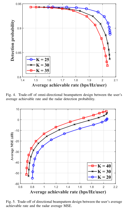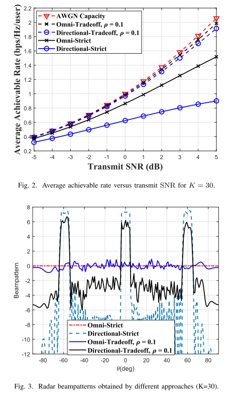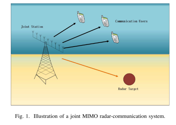 上述共存方法的关键缺点在于,雷达和通信设备通常需要交换辅助信息以实现有益的协作,例如信道状态信息、雷达探测波形和通信调制格式。这导致了系统相当大的额外复杂性,并且因此难以在实际场景中实现。新的双功能雷达通信(RadCom)系统被认为是克服这一不足的一种有利的CRSS方法。作为一种使能解决方案,双功能波形设计可同时支持目标检测和信息传输。已经对单天线系统[19]-[22]的这种可能性进行了探索,其中已经提出了几种集成波形来联合收割机雷达和通信信号。此外,[23]、[24]考虑了通过不同的波束形成器加权因子在天线上进行波形混洗或相移键控(PSK)作为通信调制方案。这些方法的共同特征在于,一个通信符号由一个或多个雷达脉冲表示,这导致雷达脉冲重复频率(PRF)量级的低数据速率。