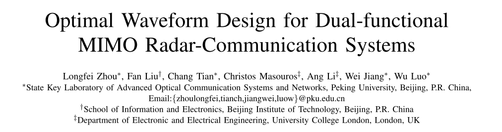 本文的贡献是两种基于优化的新颖的双功能MIMO RadCom系统波形设计。首先,我们考虑在保证雷达性能最佳的特定雷达约束下,通过最小化下行链路MUI来进行波形设计。接下来,我们考虑在功率预算约束下雷达和通信性能之间的折衷优化。虽然是非凸的,但这两个问题都得到了有效的解决。值得强调的是,所提出的方法产生了可证明的全局最优波形,可用于同时目标检测和下行通信。仿真实验结果表明,该折衷优化方法可在通信性能和雷达性能之间取得较好的平衡。