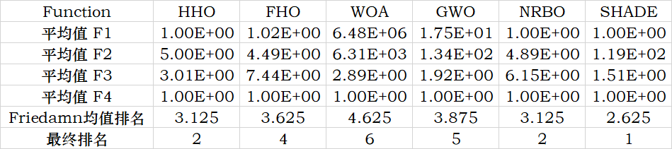 params.algorithms = {'HHO','FHO','WOA','GWO','NRBO','SHADE'};