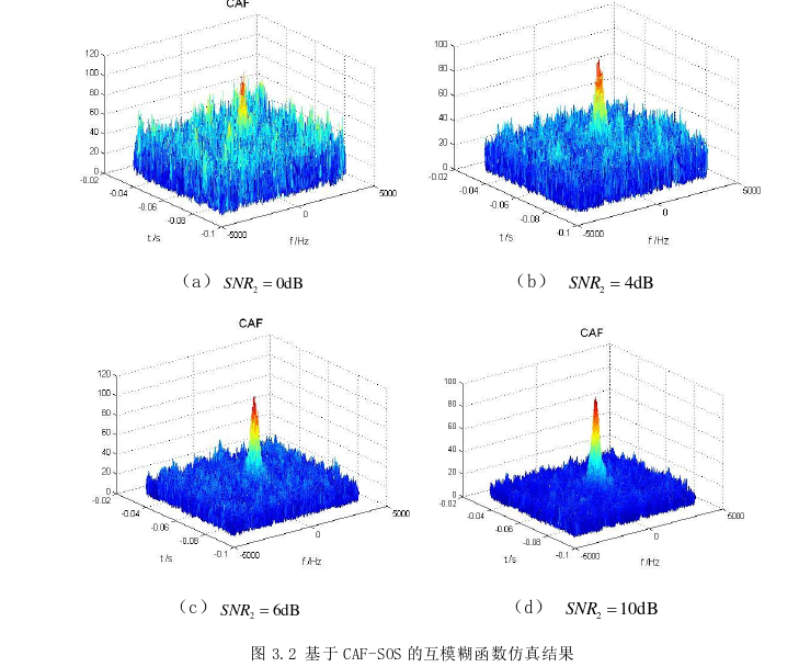 第三章在互模糊函数估计方法的基础上,分析了它的不足之后,给出了一种提高精度的 互模糊函数参数估计方法CAFI方法,并做了理论推导和性能分析,最后进行了实验仿真, 对其性能和互模糊函数进行了比较。