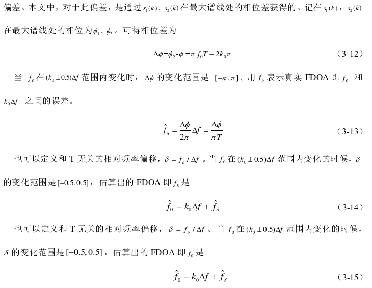 由于利用互模糊函数对TDOA和FDOA参数的估计精度和计算积累时间相关,为了得到 足够精度的估计结果,必须积累相当多的样点进行互模糊函数计算[ 50][51]。因此,直接根据二 阶互模糊函数的定义估算TDOA/FDOA存在计算量大、算法效率低等缺点。实际上,该方法 通常使用具有较高计算效率的快速傅里叶变换方法来代替互模糊函数中的相关计算。因此, 其定位精度取决于离散傅里叶变换(DFT)的频谱分辨率,其受离散傅立叶变换长度的影响 [52][53]。在本章中,提出了一种称为CAFI的方法,可以在估计TDOA的同时,提高FDOA的 准确性,其使用CAF峰值周围频率之间的相邻CAF值的相位差的线性插值来估计FDOA。