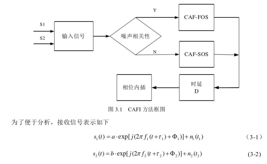 CAFI方法基于传统的CAF方法实现。 如图3.1所示,对于具有时间差和频率差的两个 信号,首先,根据信号中噪声的相关性,选择基于FOS的互模糊函数或选择基于SOS的互 模糊函数方法。 如果噪声是相关的,我们使用CAF-FOS,反之,使用CAF-SOS方法。 然 后计算两个信号的时间延迟D并将其代入后续计算中。