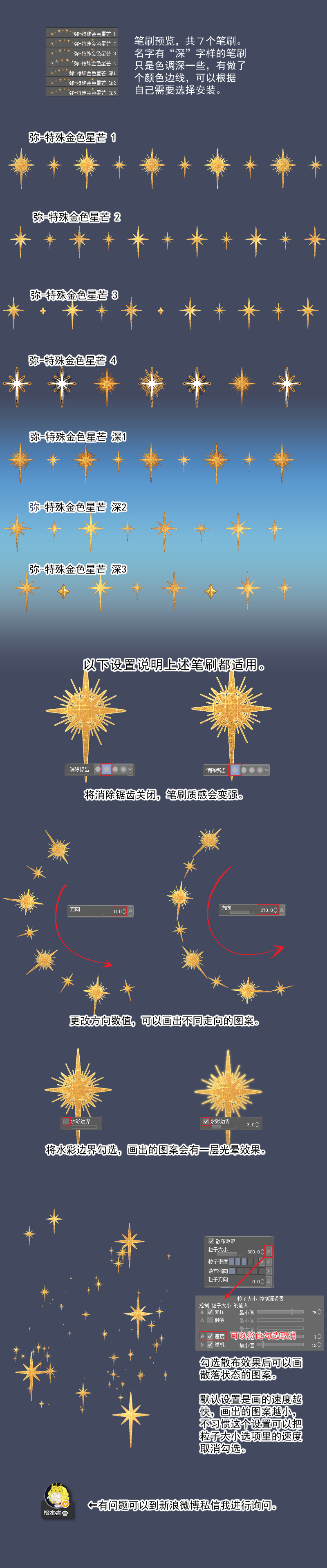 制作笔刷和说明图片也挺费时间的,如果喜欢还请支持一下~以后也会放出更多笔刷的。 ₍₍ ◝( ・'ω'・ )◟ ⁾⁾ 笔刷可用于商业及同人绘画中,禁止做为主体使用,禁止将笔刷素材进行商业贩售,禁止将笔刷素材二改上传。PS:笔刷下载拉到最底下哦。(๑•ั็ω•็ั๑)