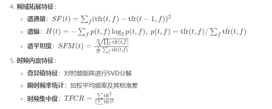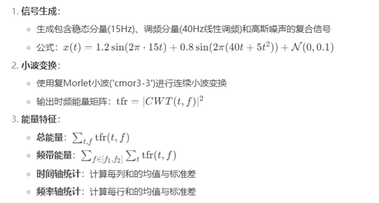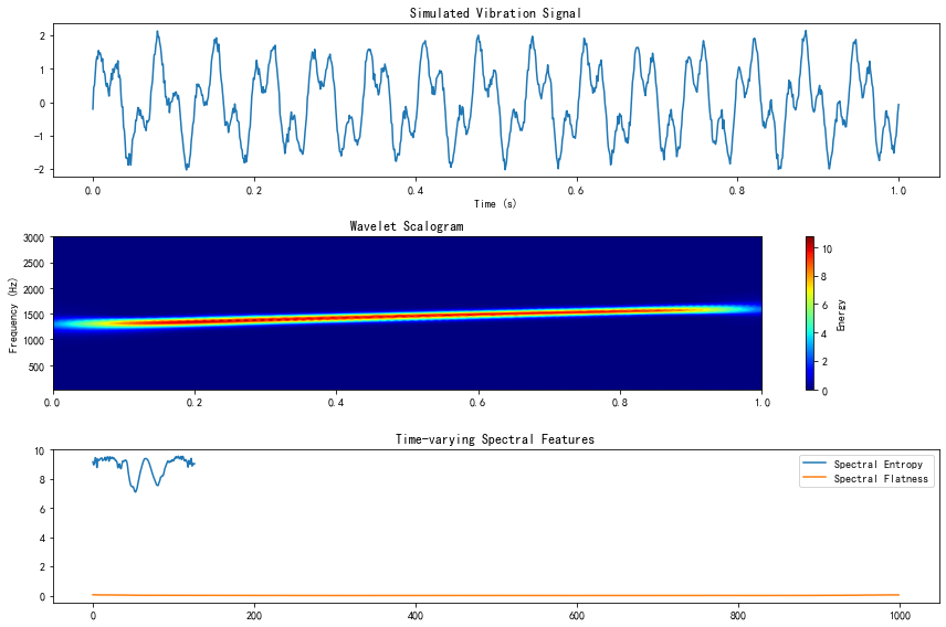 基于时频谱图特征提取的Python代码,包含能量特征、频域拓展特征和时频内禀特征的计算,代码采用小波分析处理模拟振动信号。
