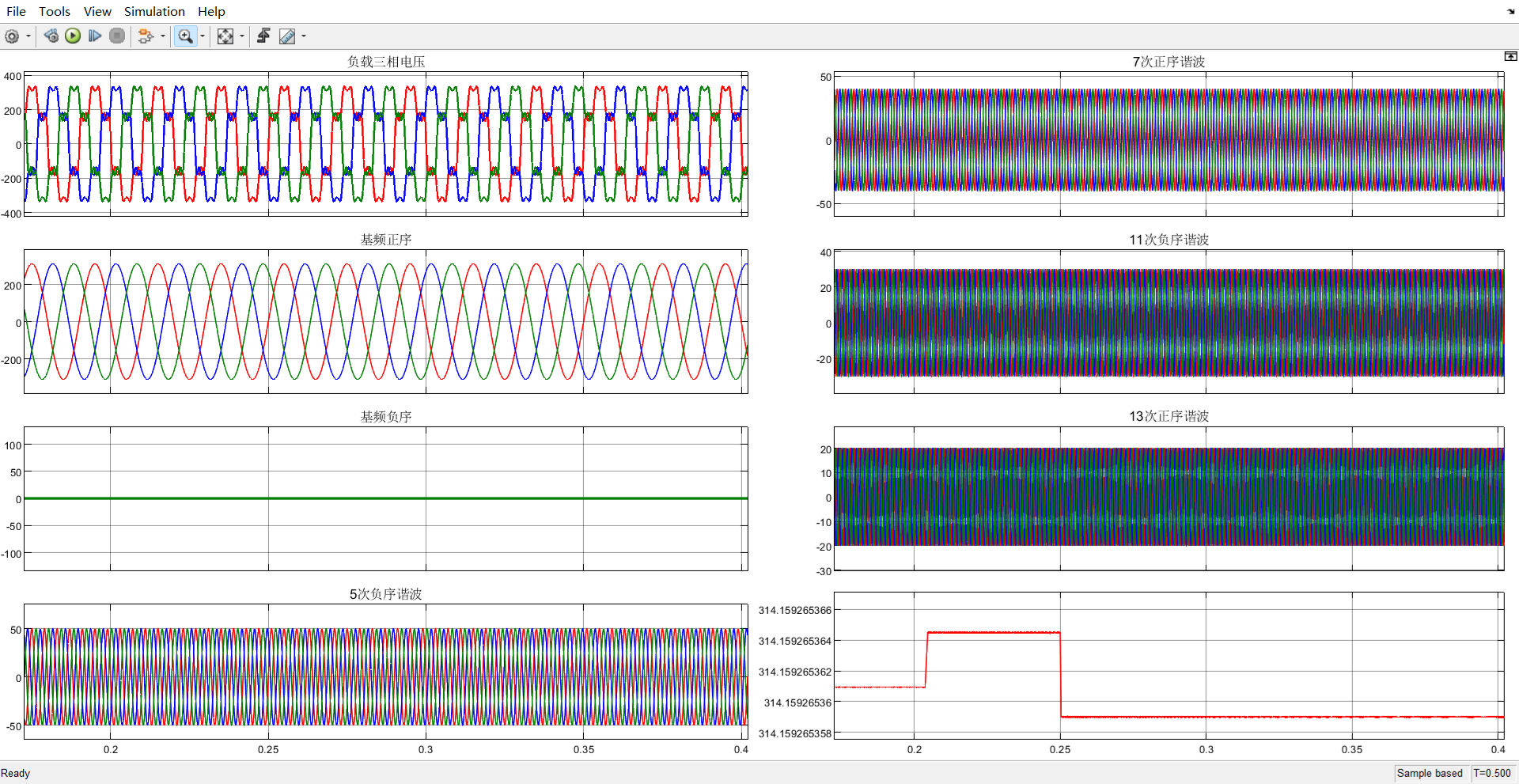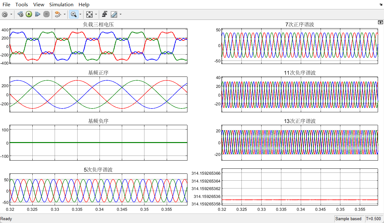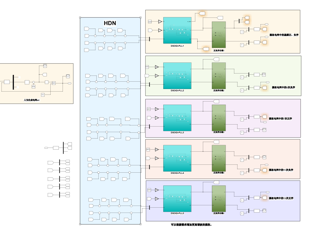 2、基于多二阶广义积分器的电网谐波分量提取,可以准确提取电网中的基频负序,5次负序,7次正序,11次负序,13次正序电压幅值,并且可以根据需求增加更高谐波的提取。