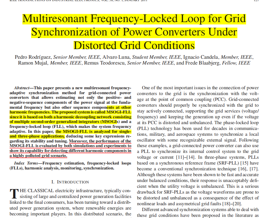 3、仿真结果表明,在不平衡电网条件下,MSOGI-FLL是一种非常适合准确检测电网电压基频正负序分量及其相关谐波的解决方案。