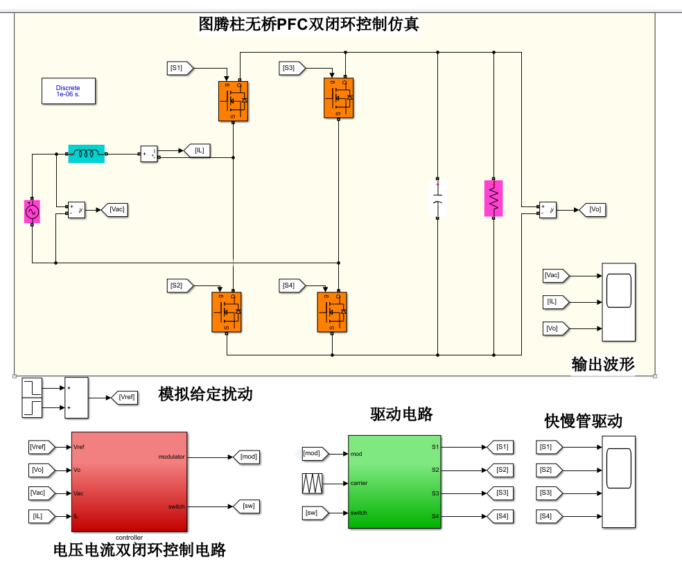 1、拓扑为单相图腾柱PFC电路,采用输出电压外环、电流内环控制策略