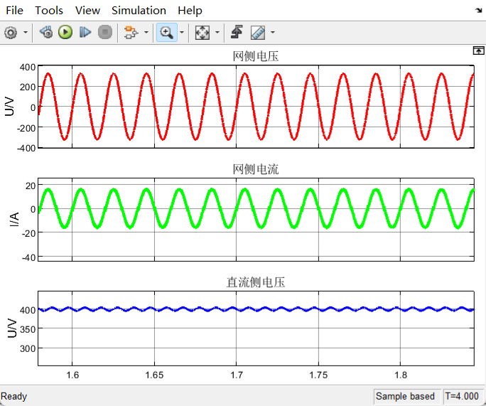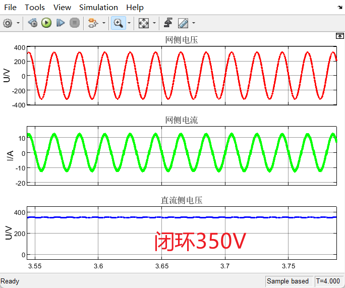 4、在2秒时,闭环输出电压400V阶跃至350V,可以看到跟踪性能优越